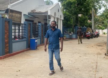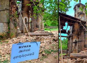 இனியும் இடிந்து விழாதிருக்க இரும்புக் கம்பிகளால் முட்டுக்கொடுக்கப்பட்ட மந்திரிமனை