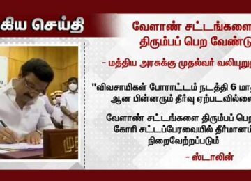 விவசாயிகளின் இன்றைய நாடு தழுவிய போராட்டத்திற்கு திமுக ஆதரவு தெரிவித்த நிலையில் வேளாண் சட்டங்களை திரும்ப பெற கோரி முதலமைச்சர் மு.க.ஸ்டாலின் வலியுறுத்தி உள்ளார்.3 வேளாண் சட்டங்களையும் மத்திய அரசு திரும்பப் பெற வேண்டும் என்று முதலமைச்சர் மு.க.ஸ்டாலின் வலியுறுத்தி உள்ளார்.…