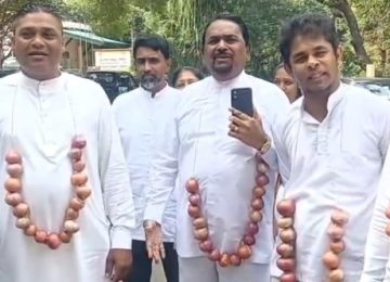 தம்புள்ளை பிரதேச சபையின் எதிர்க்கட்சியினைச் சேர்ந்த உறுப்பினர்கள், நேற்று (12) நடைபெற்ற சபை அமர்வுக்கு உள்நாட்டுப் பெரிய வெங்காயங்களால் கோர்க்கப்பட்ட மாலைகளை அணிந்துகொண்டு கலந்துகொண்டனர்.