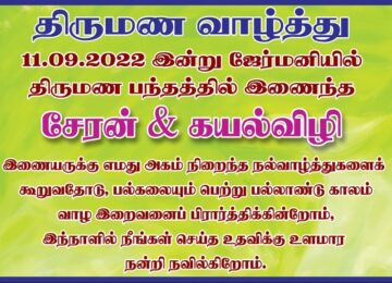 11.09.2022 அன்று யேர்மனியில் திருமண பந்தத்தில் இணைந்த சேரன் ரூ கயல்விழி இணையரின் உறவுகளின் ஏற்பாட்டில் தற்போது நிலவும் பொருளாதார நெருக்கடியில் எங்களது பட்டிணிச்சாவை தீர்க்கும் முகமாக மட்டக்களப்பு மாவட்டத்தின் வெல்லாவெளி பிரதேச செயலாளர் பிரிவிலுள்ள பிலாலிவேம்பு கிராமத்திலுள்ள அனைத்துக் குடும்பங்களும்…