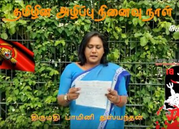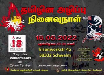 தமிழின அழிப்பினை வேற்றின மக்களுக்கு வெளிப்படுத்தும் வகையில், யேர்மனியில் 16 நகரங்களில் ஒழுங்குபடுத்தப்பட்ட கவனயீர்ப்பு நிகழ்வு இன்று 15. 05. 2022 பீலபெல்ட் நகரில் இடம்பெற்றது. கவனயீர்ப்பு நிகழ்வு சுடர் மலர் வணக்கத்தோடு ஆரம்பித்து வேற்றின மக்களுக்கான ஓவியக் காட்சிப்படுத்தல்களோடு துண்டுப்பிரசுரங்களும்…