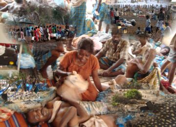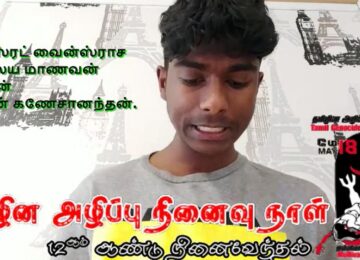 நந்திக்கடலோரக் காற்று. ******* *** ஒரு வானத்து திரள் முகில்களின் அடிர்த்தியான குளிர்காற்றை கரைத்துவிடும் சூரியனைப்போல் ஒரு இனத்தின் உடலைக்கிழித்து மானத்தின் போர்வைகளை வேரோடு தின்று இரத்தக் கலவையில் ஊடறுத்து ஓடியது நந்திக் கடலிலொரு சிவப்பு காட்டாறு…! அழுகைகளின் ஓலக்குரல்கள்…