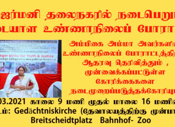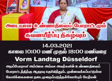 அறப்போராளி அம்பிகை அம்மா அவர்களின் உண்ணாநிலைப் போராட்டத்திற்கு ஆதரவு தெரிவித்தும் , முன்வைக்கப்பட்டுள்ள கோரிக்கைகளை நடைமுறைப்படுத்தக்கோரியும் Germany Düsseldorf நகரில் நடைபெறும் அடையாள உண்ணாநிலைப் போராட்டமும் கவனயீர்ப்பு நிகழ்வும். 14.03.2021 காலை 10:00 மணி முதல் மாலை 18:00 மணிவரை Vorm…
