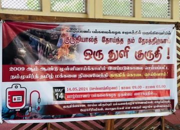 யாழ்ப்பாணப் பல்கலைக்கழக மாணவர் ஒன்றியத்தின் ஒருங்கிணைப்பில் 2009 ஆம் ஆண்டு முள்ளிவாய்க்காலில் இனஅழிப்புச் செய்யப்பட்ட தமிழ் மக்களை நினைவேந்தி குருதிக் கொடை நிகழ்வு இன்று (14.05.2024) செவ்வாய்க்கிழமை யாழ்ப்பாணப் பல்கலைக்கழக மாணவர் கட்டடத் தொகுதியில் முன்னெடுக்கப்பட்டு வருகின்றது. பல்கலைக்கழக மாணவர்கள், ஊழியர்கள்,…