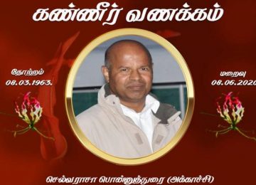 11.06.2020 செல்வராசா பொன்னுத்துரை அவர்களுக்கு ‘‘நாட்டுப்பற்றாளர்’’ மதிப்பளிப்பு. தாயகவிடுதலைப் பயணத்தில் தொடக்ககாலப் போராளியாகவும் பின்னர் டென்மார்க் கிளையின் வீபோ நகர செயற்பாட்டாளருமான செல்வராசா பொன்னுத்துரை அவர்கள் 08.06.2020 அன்று சாவடைந்தார் என்னும் செய்தி எம்மைத் துயரத்தில் ஆழ்த்தியுள்ளது. அக்காச்சியண்ணை என அன்பாக…