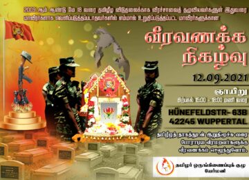 2009 ஆம் ஆண்டு மே 18 வரை தமிழீழ விடுதலைக்காக வீரச்சாவைத் தழுவியவர்களுள் இதுவரை மாவீரர்களாக வெளிப்படுத்தப்படாதவர்களில் எம்மால் உறுதிப்படுத்தப்பட்ட மாவீரர்களுக்கான வீரவணக்க நிகழ்வு. 12.09.2021 ஞாயிறு பிற்பகல் 15.00 – 18.00 மணி வரை யேர்மனி வூப்பெற்றால் நகரில் அமைந்துள்ள…