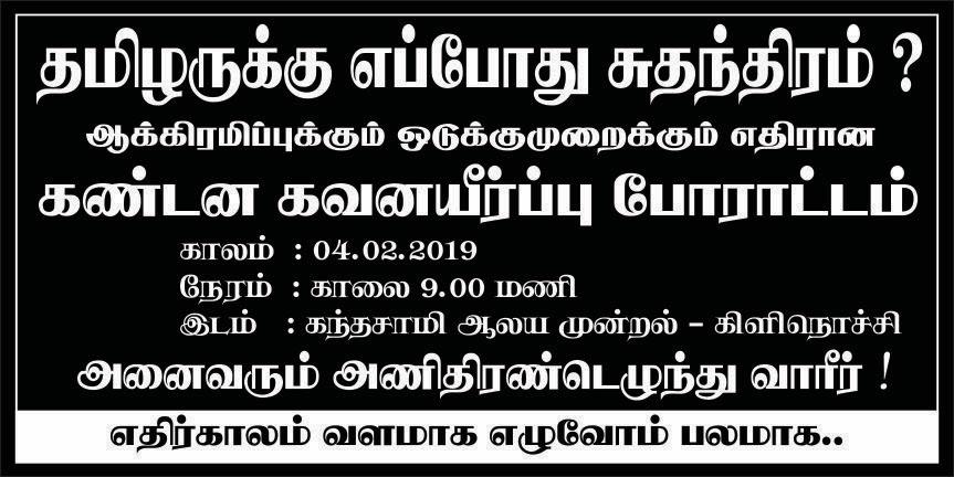 2019 பெப்ரவெரி 4ந் திகதி சுதந்திர தினத்தைக் கரிநாளாகப் பிரகடனப்படுத்தி இன்று காலை 10 மணிக்கு கிளிநொச்சியில் கந்தசாமி ஆலயத்திற்கு முன்பாக போராட்டம் ஒன்று நடைபெற்றது. அதில் தமிழ் மக்கள் கூட்டணியின் செயலாளர் நாயகம் நீதியரசர் க.வி.விக்னேஸ்வரன் அவர்களும் கலந்து கொண்டார்.…