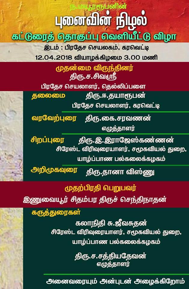 மயூரரூபனின் புனைவின் நிழல் கட்டுரைத்தொகுப்பின் வெளியீட்டு விழா ஏப்ரல் 12 (வியாழக்கிழமை மாலை) கரவெட்டி பிரதேச செயலர் அலுவலகத்தில் நடைபெறவுள்ளது.