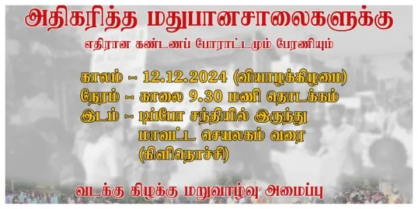 கிளிநொச்சி மாவட்டத்தில் அதிகரித்த மதுபானசாலைகளுக்கு எதிரான கண்டனப் போராட்டமும் பேரணியும் எதிர்வரும் வியாழக்கிழமை (12.12.2024) அன்று காலை 9.30 மணி…