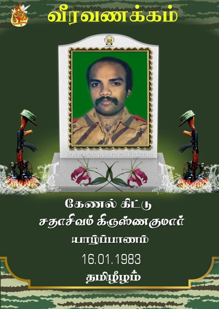 கேணல் கிட்டுவின் வீரகாவியம் Posted by தென்னவள் - January 17, 2025 ஈழ விடுதலைக்காகப் போராடிய விடுதலைப் புலிகளின் முக்கிய தளபதிகளில் ஒருவராக இருந்தவர் கேணல் கிட்டு என அழைக்கப்பட்டும் சதாசிவம் கிருஷ்ணகுமார்.இவர்… Read More