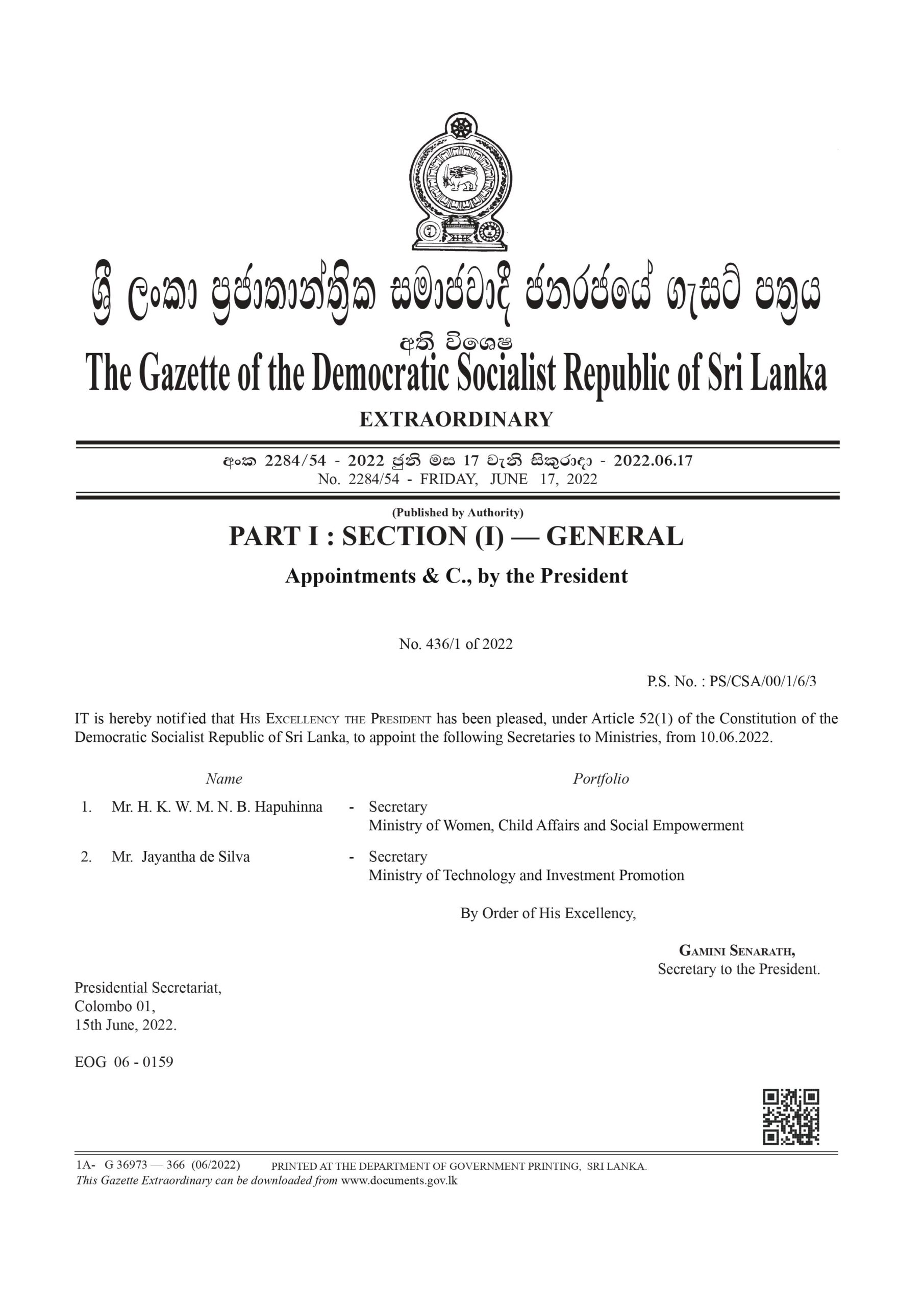 இரண்டு அமைச்சுகளுக்கான புதிய செயலாளர்கள் நியமனம்
