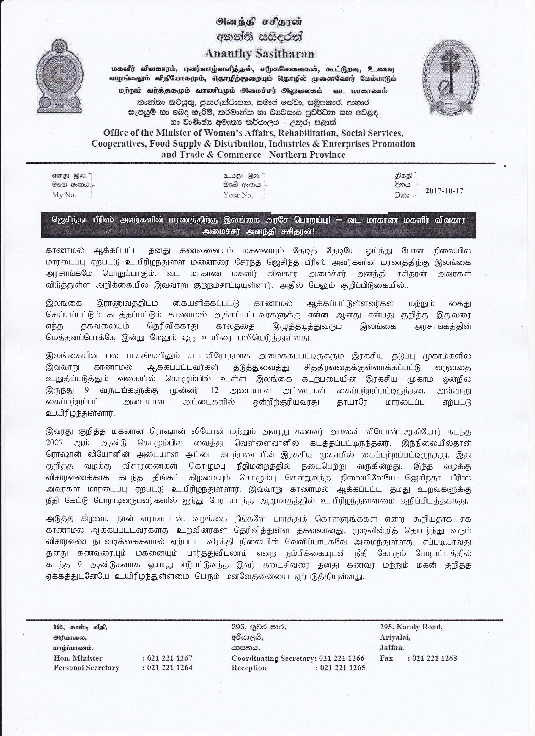 காணாமல் ஆக்கப்பட்ட தனது கணவனையும் மகனையும் தேடித் தேடியே ஓய்ந்து போன நிலையில் மாரடைப்பு ஏற்பட்டு உயிரிழந்துள்ள மன்னாரை சேர்ந்த ஜெசிந்த பீரிஸ் அவர்களின் மரணத்திற்கு இலங்கை அரசாங்கமே பொறுப்பாகும். வட மாகாண மகளிர் விவகார அமைச்சர் அனந்தி சசிதரன் அவர்கள் விடுத்துள்ள அறிக்கையில் இவ்வாறு குற்றம்சாட்டியுள்ளார். அதில் மேலும் குறிப்பிடுகையில்..