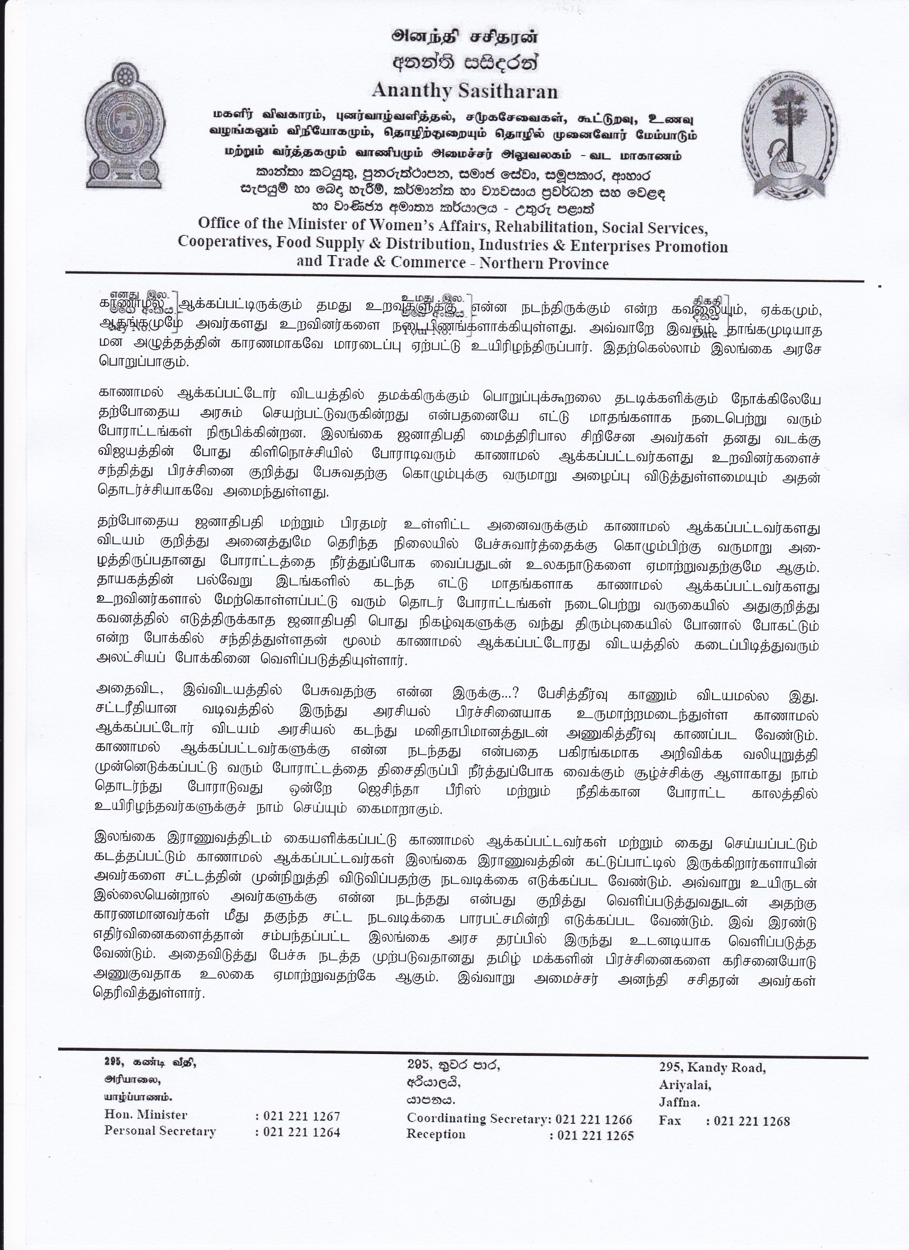 இலங்கை இராணுவத்திடம் கையளிக்கப்பட்டு காணாமல் ஆக்கப்பட்டவர்கள் மற்றும் கைது செய்யப்பட்டும் கடத்தப்பட்டும் காணாமல் ஆக்கப்பட்டவர்கள் இலங்கை இராணுவத்தின் கட்டுப்பாட்டில் இருக்கிறார்களாயின் அவர்களை சட்டத்தின் முன்நிறுத்தி விடுவிப்பதற்கு நடவடிக்கை எடுக்கப்பட வேண்டும். அவ்வாறு உயிருடன் இல்லையென்றால் அவர்களுக்கு என்ன நடந்தது என்பது குறித்து வெளிப்படுத்துவதுடன் அதற்கு காரணமானவர்கள் மீது தகுந்த சட்ட நடவடிக்கை பாரபட்சமின்றி எடுக்கப்பட வேண்டும். இவ் இரண்டு எதிர்வினைகளைத்தான் சம்பந்தப்பட்ட இலங்கை அரச தரப்பில் இருந்து உடனடியாக வெளிப்படுத்த வேண்டும். அதைவிடுத்து பேச்சு நடத்த முற்படுவதானது தமிழ் மக்களின் பிரச்சினைகளை கரிசனையோடு அணுகுவதாக உலகை ஏமாற்றுவதற்கே ஆகும். இவ்வாறு அமைச்சர் அனந்தி சசிதரன் அவர்கள் தெரிவித்துள்ளார்.