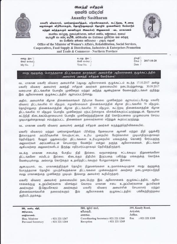 வட மாகாண மகளிர் விவகார அமைச்சின் 2ஆவது ஆலோசனைக் குழுக்கூட்டம் கடந்த 17.10.2017 அன்று மகளிர் விவகார அமைச்சர் அனந்தி சசிதரன் அவர்கள் தலைமையில்; நடைபெற்றுள்ளது. 30.09.2017 வரையான திட்டங்களின் பௌதீக முன்னேறம் மற்றும் அடுத்த ஆண்டிற்கான வேலைத்திட்டங்கள் குறித்து இவ் ஆலோசனைக் குழுக்கூட்டத்தில் ஆராயப்பட்டுள்ளது.