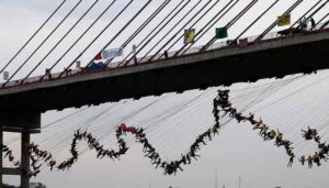 அதன்படி ஹோர் டோலான்டியா பாலத்தில் இருந்து 245 பேர் ஒரே நேரத்தில் கயிறு கட்டியபடி கீழே குதித்தனர். 30 மீட்டருக்கும் அதிகமான உயரம் உள்ள இப்பாலத்தில் இருந்து அவர்கள் குதித்த வீடியோ வெளியிடப்பட்டுள்ளது.