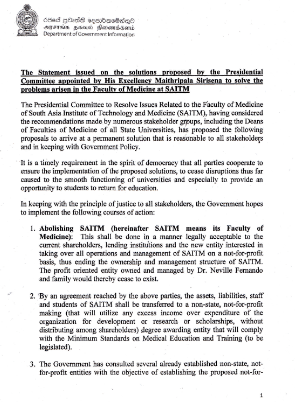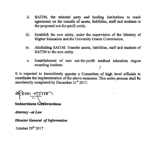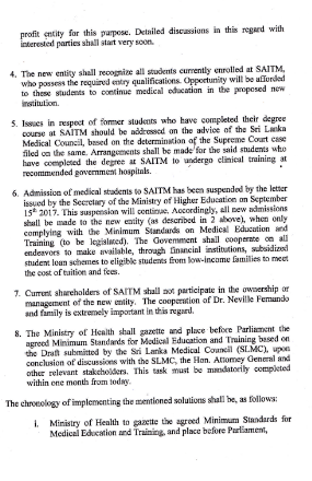 உச்சநீதிமன்றத் தீர்ப்பின் அடிப்படையில், ஸ்ரீலங்கா மருத்துவக் கவுன்சிலின் ஆலோசனையின்படி சைட்டம் இல் தங்கள் பட்ட படிப்புகளை பூர்த்தி செய்தவர்கள் தொடர்பான பிரச்சினைகள் குறித்து விவாதிக்கப்பட வேண்டும்.