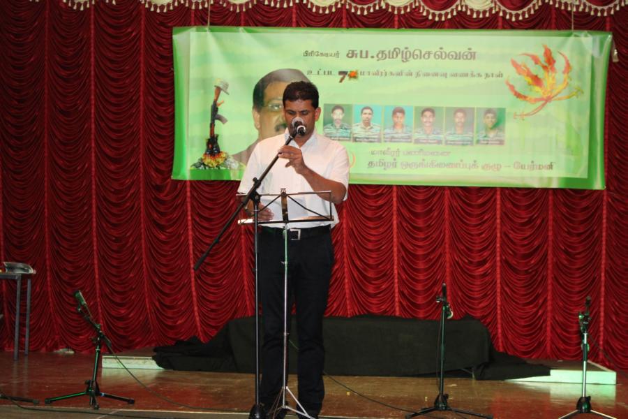 5.11.2017 ஞாயிற்றுக்கிழமை யேர்மனி வூப்பெற்றால் நகரில் பிரிகேடியர் தமிழ் செல்வன் மற்றும் அவருடன் வீரச்சாவைத் தழுவிக்கொண்ட மாவீரர்களின் வணக்க நிகழ்வு மிகச்சிறப்பாக மண்டபம் நிறைந்த மக்களுடன் நடைபெற்றது. ஈகைச்சுடர் மற்றும் தேசியக்கொடி ஏற்றத்துடன் ஆரம்பிக்கப்பட்ட இந் நிகழ்;வில் பிரிகேடியர் தமிழ்செல்வன் அவர்களின் துணைவியார் அவர்கள் கலந்துகொண்டு பிரிகேடியர் தமிழ்செல்வன் அவர்களின் திருவுருவப் படத்திற்கு மாலை அணிவித்தார். அவருடன் வீரச்சாவைத் தழுவிக்கொண்ட மற்றைய ஐந்து மாவீரர்களுக்கும் மாவீரர் குடும்பத்தைச் சேர்ந்தவர்களும் செயற்பாட்டாளர்களும் மாலை அணிவித்து சுடர்வணக்கமும் செய்தனர்.