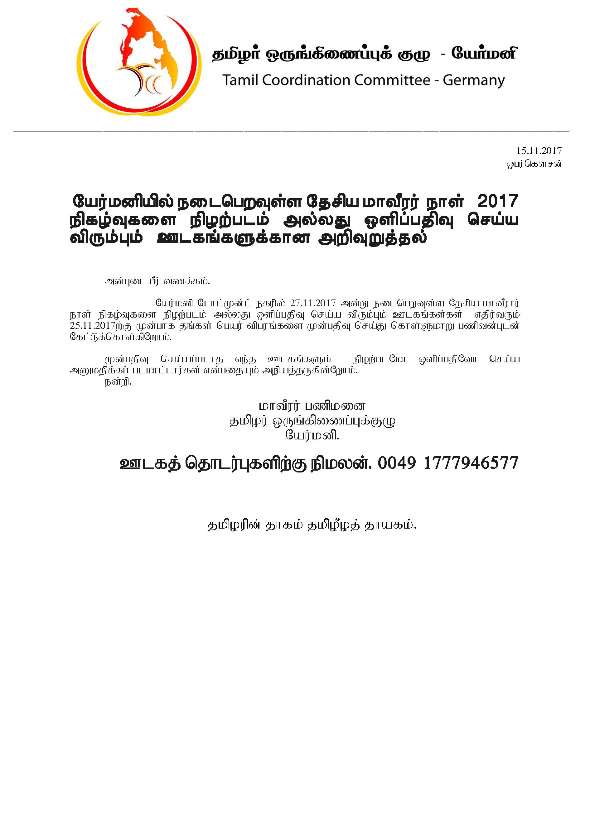 யேர்மனியில் நடைபெறவுள்ள தேசிய மாவீரர் நாள் 2017 நிகழ்வுகளை நிழற்படம் அல்லது ஒளிப்பதிவு செய்ய விரும்பும் ஊடகங்களுக்கான அறிவுறுத்தல்.அன்புடையீர் வணக்கம்.