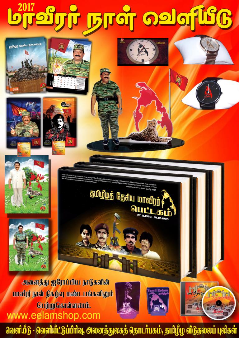 தமிழர்களின் வரலாறுகளையும், தமிழீழ விடுதலைப் போராட்ட நினைவுகளையும் சுமந்து 27 .11 .2017 அன்று வெளிவருகிறது புதிய சிறப்பு வெளியீடுகள் இவ்வெளியீடுகளைப் புலம்பெயர் தேசத்தில் வாழும் ஈழத் தமிழர்கள் அனைவரும் மாவீரர் நாள் நடைபெறும் மண்டபத்தினுள் அமையப்பெறும் தமிழர் ஒருங்கிணைப்புக் குழுவின் வெளியீட்டுப் பிரிவில் பெற்றுக்கொள்ளலாம். தமிழர் ஒருங்கிணைப்புக் குழுவின் அலுவலகங்கள் இல்லாத நாடுகளில் வாழும் தமிழ் மக்கள் அனைவரும் அனைத்துலகத் தொடர்பகத்தின் வெளியீட்டுப் பிரிவின் மின்னஞ்சல் முகவரி ஊடாகத் தொடர்புகளை ஏற்படுத்தியும் www.eelamshop.com என்ற இணையமூலமாகவும் விரும்பும் வெளியீடுகளை பெற்றுக்கொள்ளலாம்.