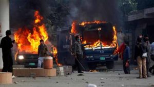 அதை தொடர்ந்து போராட்டக்காரர்களுக்கும், போலீசாருக்கும் இடையே மோதல் ஏற்பட்டது. பின்னர் அது கலவரமாக மாறியது. இது தலைநகர் இஸ்லாமாபாத் மட்டுமின்றி பாகிஸ்தானின் பிற நகரங்களான கராச்சி, ஐதராபாத், லாகூர், குஜ்ரத், குஷ்ரன் வாலா, பைசலா பாத், பெஷாவர் உள்ளிட்ட இடங்களுக்கும் பரவியது. அங்கு மதவாதிகள் போராட்டத்தில் ஈடுபட்டனர்.