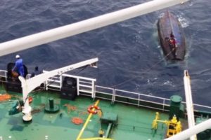 படகு கவிழ்ந்த நிலையில், அதன் மீது ஏறி நின்று உதவி கோரிய ஐந்து மீனவர்களை ஈரானிய எண்ணெய்க் கப்பல் காப்பாற்றியது.