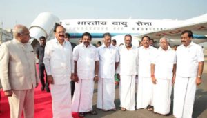 சென்னை விமான நிலையத்தில் வெங்கையா நாயுடுவை தமிழக ஆளுநர் பன்வாரிலால் புரோஹித், முதல்வர் எடப்பாடி பழனிசாமி, துணை முதல்வர் ஓ. பன்னீர் செல்வம் மற்றும் அரசு உயரதிகாரிகள் வரவேற்றனர்.