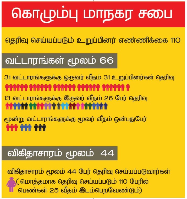 எஞ்சிய 44 பேரை இப்போது நாம் விகிதா சார முறைமையில் தெரிவுசெய்யவேண்டியுள்ளது. தற்போது கொழும்பு மாநகரசபையில் 31+13+3 என்றவகையில் 47 வட்டாரங்கள் உருவாக்கப்பட்டு அவற்றுக்காக 66 பேர் தெரிவு