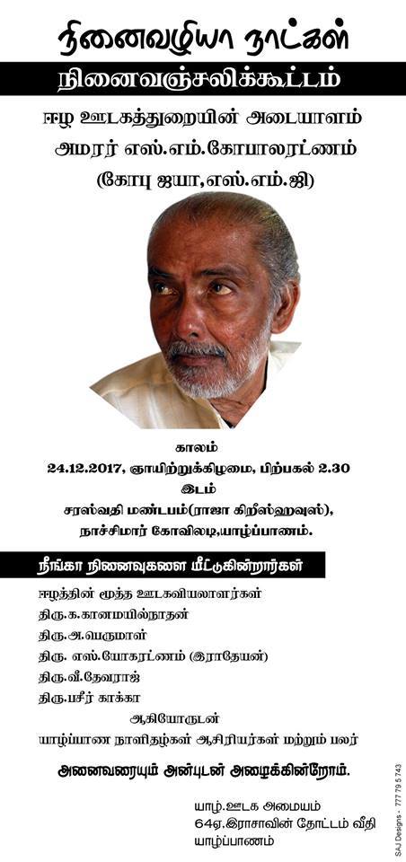 தமிழீழம் SMG ன் நினைவழியா நாட்கள் – நினைவஞ்சலிக் கூட்டம் Posted on December 20, 2017 at 08:47 by தென்னவள் 352 0 SMG ன் நினைவழியா நாட்கள் – நினைவஞ்சலிக் கூட்டம்