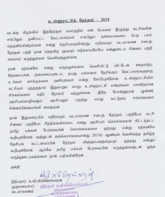 நான் இதுவரையில் எதிர்வரும் வடமாகாண சபைத் தேர்தல் பற்றியோ கட்சி சின்னம் பற்றியோ இப்போது சிந்திக்கவில்லை. எனது அரசியல் கொள்கைகள் கிட்டத்தட்ட தமிழ் மக்கள் பேரவையின் கொள்கைகளை ஒத்தது என்று ஏற்கனவே கூறியுள்ளேன். அத்துடன் அக்கொள்கையானது 2013ம் ஆண்டில் வெளிவந்த தமிழ்த் தேசியக் கூட்டமைப்பின் தேர்தல் விஞ்ஞாபனத்தையும் ஒத்தது என்றும் கூறியுள்ளேன். தமிழ் மக்கள் பேரவையின் கருத்துக்களுடன் ஒத்த கருத்துடையவர்களை நான் மதிக்கின்றேன்.