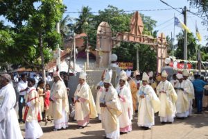 பேராலய வாசலில் மன்னார் மறைமாவட்டக் குருமுதல்வர் அருட்திரு. விக்ரர் சோசை அடிகளார் திருச்சிலுவையை வழங்க புதிய ஆயர் அதனை முத்திசெய்தார்.