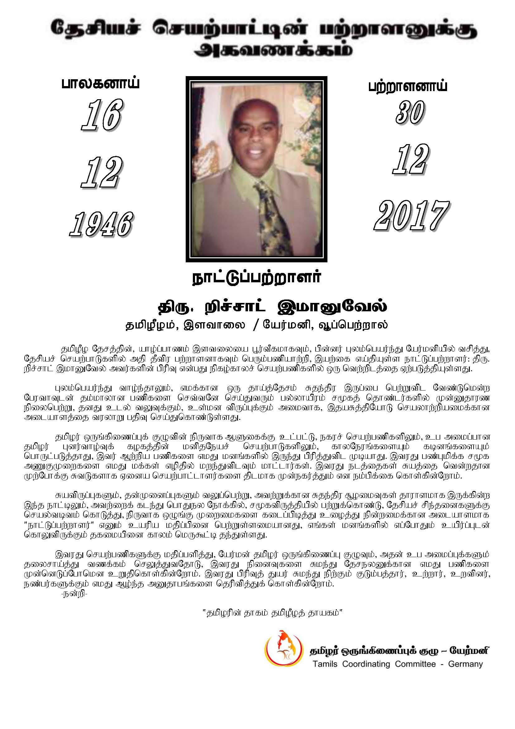 தமிழீழ தேசத்தின், யாழ்ப்பாணம் இளவலையை பூர்வீகமாகவும், பின்னர் புலம்பெயர்ந்து யேர்மனியில் வசித்து, தேசியச் செயற்பாடுகளில் அதி தீவிர பற்றாளனாகவும் பெரும்பணியாற்றி, இயற்கை எய்தியுள்ள நாட்டுப்பற்றாளர்: திரு. றிச்சாட் இமானுவேல் அவர்களின் பிரிவு என்பது நிகழ்காலச் செயற்பணிகளில் ஒரு வெற்றிடத்தை ஏற்படுத்தியுள்ளது.
