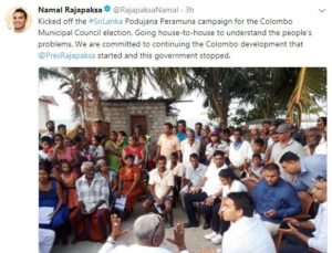கொழும்பு மாநகர சபைக்கான பொதுஜன பெறமுண கட்சியின் தேர்தல் பிரச்சாரத்தை ஆரம்பித்து வைத்து பாராளுமன்ற உறுப்பினர் அவரது டுவிட்டரில் இவ்வாறு பதிவிட்டுள்ளார்.