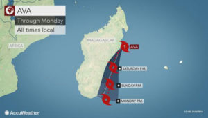 இந்த நிலையில் கடந்த வெள்ளிக்கிழமை அங்கு அவா என்று பெயரிடப்பட்ட புயல் தாக்கியது. இப்புயலினால் மடகாஸ்கரின் கிழக்கு பகுதி பெரிதும் பாதிப்படைந்துள்ளது. அப்போது மணிக்கு 140 முதல் 190 கிலோமீட்டர் வேகத்தில் பலத்த காற்று வீசியது. இதனால் மழையும் அதனால் வெள்ளப்பெருக்கும் ஏற்பட்டது. பலத்த காற்று வீசியதால் மரங்கள் வேரோடு சாய்ந்தன.