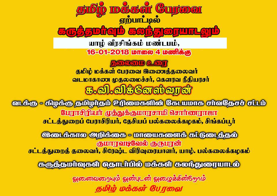 தமிழ் மக்கள் பேரவையின் ஏற்பாட்டில் எதிர்வரும் 16ஆம் திகதி செயவ்வாய்க்கிழழை மாலை 4 மணிக்கு யாழ் பல்கலைக்கழக கைலாசபதி கலையரங்கில் நடைபெறவிருந்த கருத்தமர்வும் கலந்துரையாடலும் நிகழ்வானது அக் கலையரங்கம் பயன்படுத்துவதற்கான அனுமதி இரத்துச் செய்யப்பட்டதால் யாழ் வீரசிங்கம் மண்டபத்திற்கு இடம் மாற்றப்பட்டுள்ளது என்பதை அறியத் தருகிறோம்.