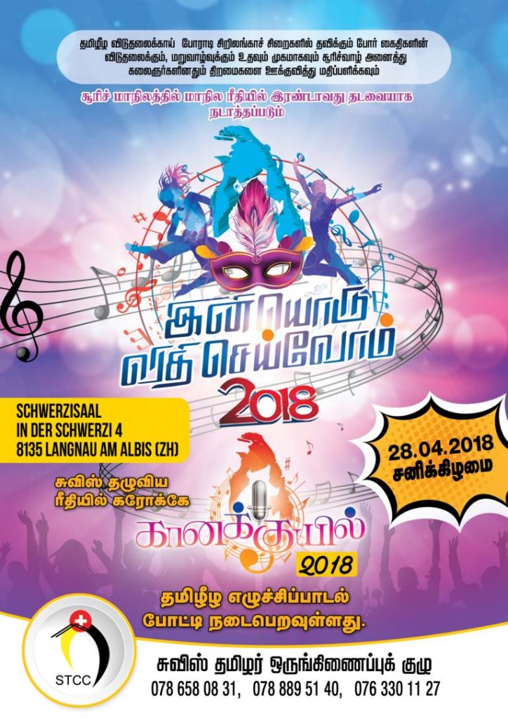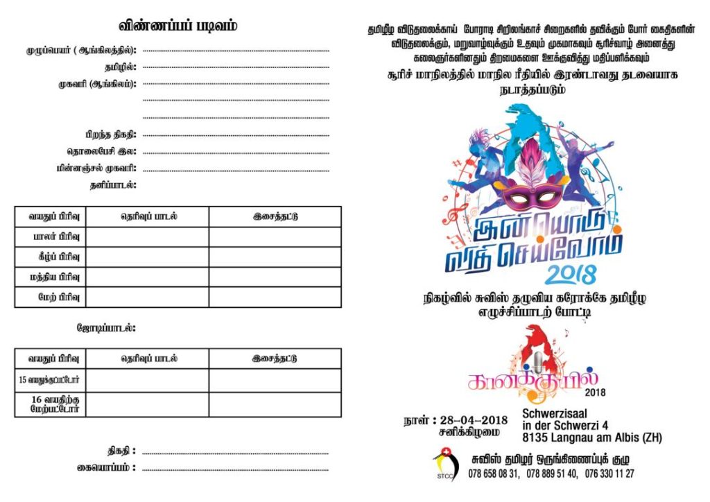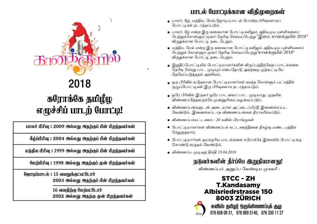 இந் நிகழ்வில் சுவிஸ் தழுவிய ரீதியில் கரோக்கே தமிழீழ எழுச்சிப் பாடல் போட்டி நடைபெறவுள்ளது. அதற்கான விண்ணப்பப் படிவமும் இத்துடன் இணைக்கப்பட்டுள்ளது.