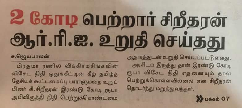பிரதமர் ரணில் விக்கிரமசிங்கவின் விசேட நிதி ஒதுக்கீட்டின் கீழ் தமிழ்த் தேசியக் கூட்டமைப்பு நாடாளுமன்ற உறுப்பினர் சி.சிறீதரன் இரண்டுகோடி ரூபாவை அபிவிருத்தி நிதி எனும் பெயரில் பெற்றுக்கொண்டமையை தினக்குரல் பத்திரிகை ஆதாரத்துடன் உறுதிப்படுத்தியுள்ளது.