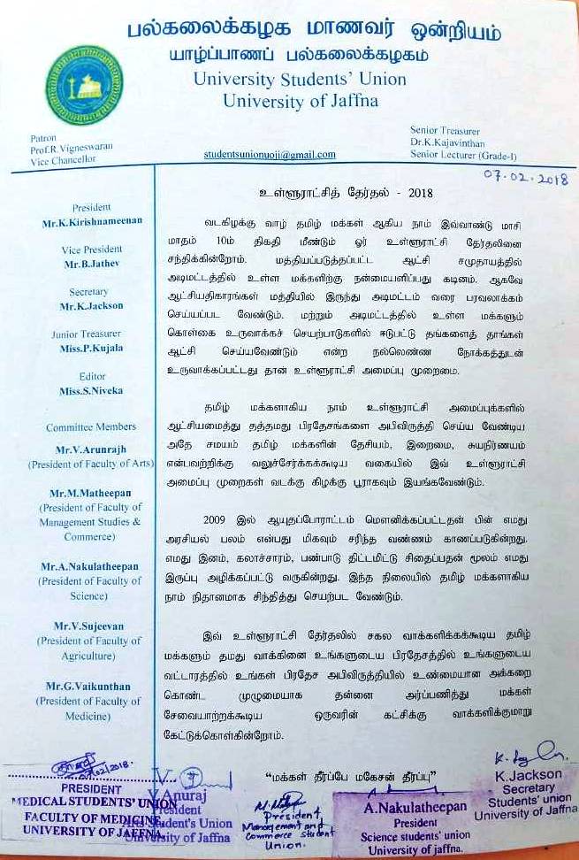 எதிர்வரும் உள்ளுராட்சி தேர்தல் தொடர்பினில் அனைத்து பீட மாணவர் ஒன்றியங்களதும் சந்திப்பு அதன் தொடர்ச்சியாக மேற்கொண்ட பேச்சுக்களின் அடிப்படையில் விடுத்துள்ள ஊடக அறிக்கையில் எமது எமது இனம் ,கலாச்சாரம்,பண்பாடு திட்டமிட்டு அழிக்கப்படுவதன் மூலம் எமது இருப்பு அழிக்கப்பட்டுவருவதாகவும் மாணவர் ஒன்றியம் தனது அறிக்கையினில் சுட்டிக்காட்டியுள்ளது.