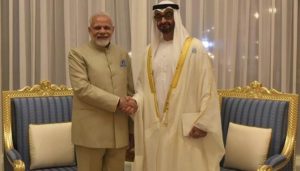 பாலஸ்தீனம் நாட்டிலிருந்து ஐக்கிய அரபு எமிரேட்ஸ் சென்ற பிரதமர் மோடிக்கு, பட்டத்து இளவரசர் முகமது பின் ஜையத் அல் நெஹயான் சிறப்பான வரவேற்பு அளித்தார்.