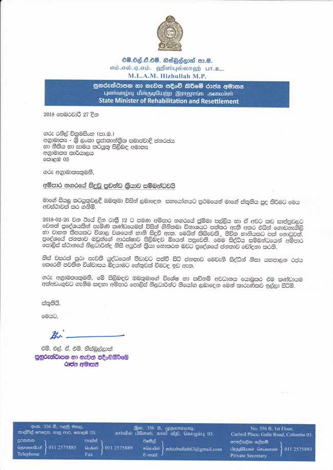 சட்டம், ஒழுங்கு அமைச்சரும் பிரதமருமான ரணில் விக்கிரமசிங்கவுக்கு இராஜாங்க அமைச்சர் ஹிஸ்புல்லாஹ் அனுப்பி வைத்துள்ள அவசர கடிதத்திலலேயே மேற்கண்டவாறு தெரிவிக்கப்பட்டுள்ளது.