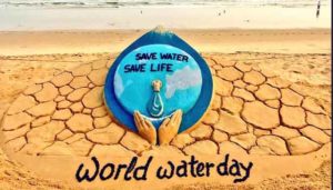 மேலும், ஒடிசா மணற்சிற்பக்கலைஞர் சுதர்சன் பட்நாய்க் உலக தண்ணீர் தினத்தையொட்டி பூரிக் கடற்கரையில் மணற்சிற்பம் செதுக்கியுள்ளார். நீரை சேமிப்போம், வாழ்வை பாதுகாப்போம் என்ற வாக்கியத்துடன் அவர் வடித்த சிற்பம் நீர் குறித்த விழிப்புணர்வை ஏற்படுத்தும் வகையில் உள்ளது.