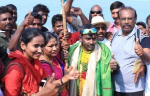 சென்னையைச் சேர்ந்த கல்லூரி மாணவர் ராஜ ஈஸ்வர பிரபு தலைமன்னார் முதல் தனுஷ்கோடி வரையிலான பாக்கு நீரிணை கடலை 12 மணி நேரத்தில் நீந்தி சனிக்கிழமை கடந்து சாதனை புரிந்தார்.