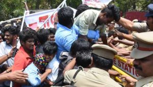 போலீசார் வைத்திருந்த தடுப்பு வேலிகளை மீறி மாணவர்கள் முன்னேறி செல்ல முயன்றதால் பரபரப்பு ஏற்பட்டது.