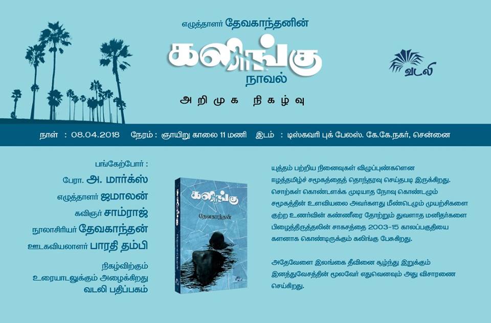 தமிழ்நாடு தேவகாந்தனின் கலிங்கு நாவலின் அறிமுக நிகழ்வு! Posted on April 3, 2018 at 09:34 by தென்னவள் 839 0 தேவகாந்தனின் கலிங்கு நாவலின் அறிமுக நிகழ்வு டிஸ்கவரி புக் பலசில் ஏப்ரல் 8ம் திகதி இடம்பெற இருக்கின்றது.