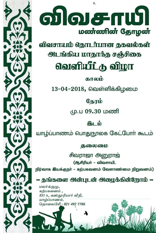 தமிழீழம் ”விவசாயி மண்ணின் தோழன்“- மாதாந்த சஞ்சிகை வெளியீட்டு விழா! Posted on April 9, 2018 at April 9, 2018 by தென்னவள் 729 0 விவசாயம் தொடர்பான தகவல்களை அடங்கிய மாதாந்த சஞசிகை வெளியீட்டு விழாவிற்கு அனைவரையும் அன்புடன் அழைக்கின்றனர் மலர் குழுவினர்.