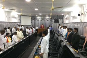 யாழ்ப்பாண மாநகர சபையின் முதலாவது அமர்வு இன்றையதினம்(11-04-2018) செவ்வாய்க்கிழமை காலை 9.30 மணிக்கு மாநகர முதல்வர் இமானுவேல் ஆனோல்ட் தலைமையில் ஆரம்பமானது.இந்நிலையில் முதல்வர் உள்ளிட்ட உறுப்பினர்கள் அனைவரும் மங்கல வாத்திய இசையுடன் சபைக்கு அழைத்துவரப்பட்டனர்.தொடா்ந்தும் முதல்வர் மற்றும் உறுப்பினர்களின் கன்னி உரைகள் இடம்பெறவுள்ளன.யாழ். மாநகரசபையின் மேயர் மற்றும் பிரதி மேயர் ஆகியோரை தெரிவுசெய்யும் முதலாவது அமர்வு, கடந்த மாதம் 26 ஆம் திகதி வடமாகாண உள்ளூராட்சி ஆணையாளர் தலைமையில் இடம்பெற்றது.இதன்போது யாழ்.மாநகரசபை மேயராக இம்மானுவேல் ஆனோல்ட் நியமிக்கப்பட்டதுடன், பிரதி மேயராக ஈசன் நியமிக்கப்பட்டமை குறிப்பிடத்தக்கது.