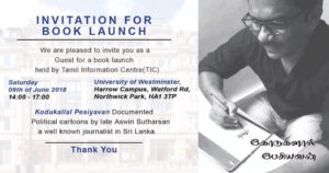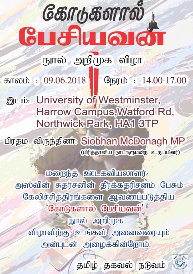 லண்டன் பல்கலைக்கழகத்தில் மாதகல் மண் மைந்தனின் நூல் அறிமுக விழா ஊடகவியலாளர் கேலிச்சித்திர கலைஞர் குறும்பட இயக்குனர் என பல் பரிமாணங்களை தன்னகம் கொண்டிருந்த மறைந்த காட்டூனிஸ்ட் மாதகல் மண்ணின் மைந்தன் அஸ்வின் சுதர்சனின் கேலிச்சித்திரங்களை அவணப்படுத்திய “கோடுகளால் பேசியவன்” என்னும் நூல் பிரித்தானியாவில் எதிர்வரும் 9 ஆம் திகதி அறிமுகம் செய்யப்படவுள்ளது.