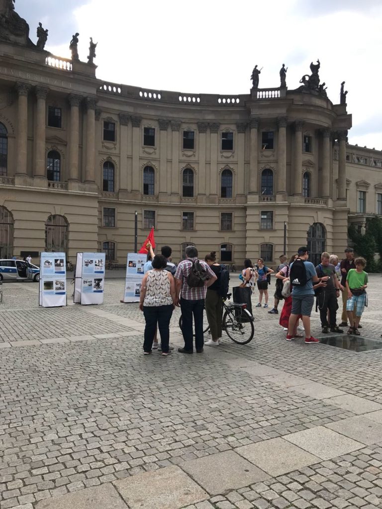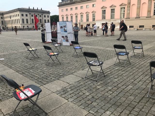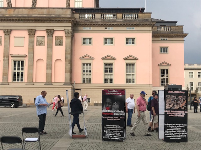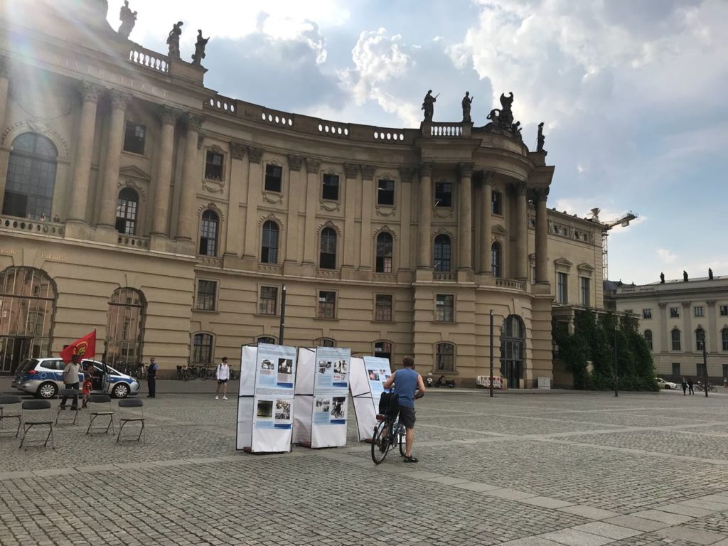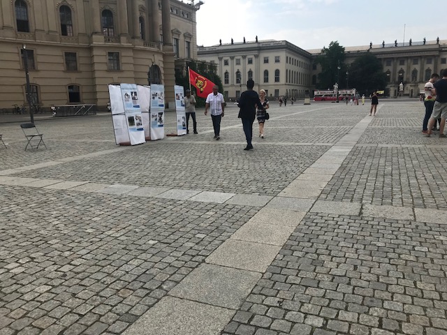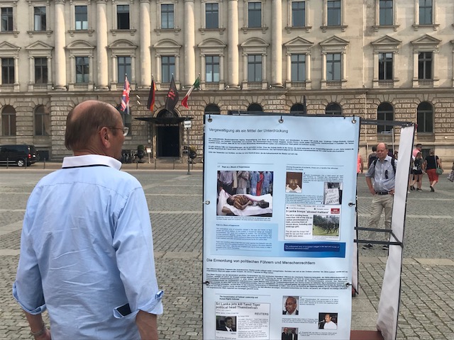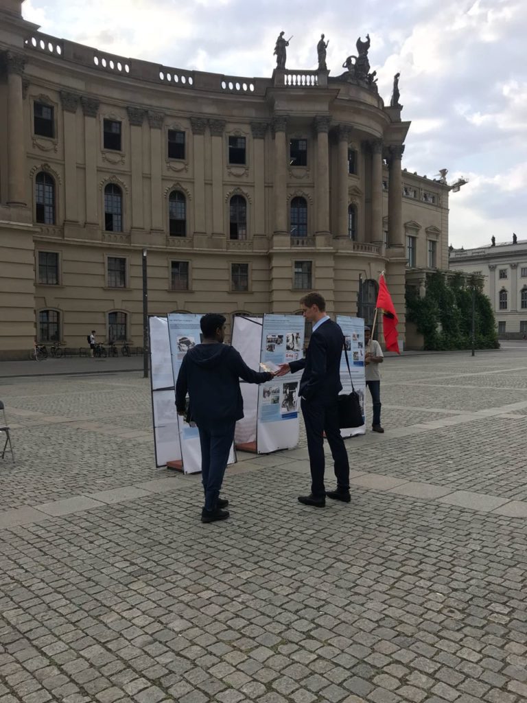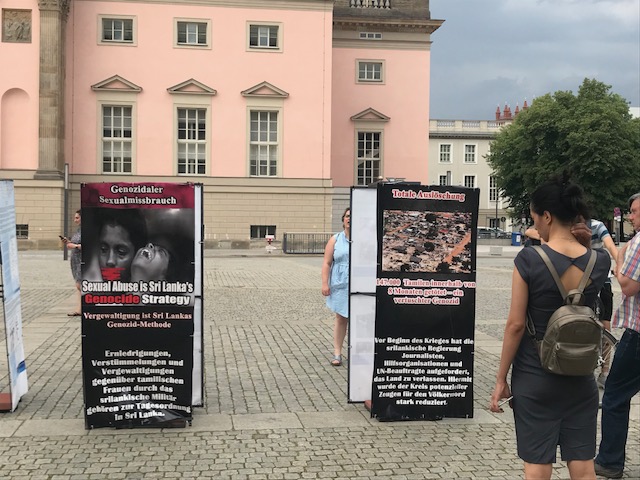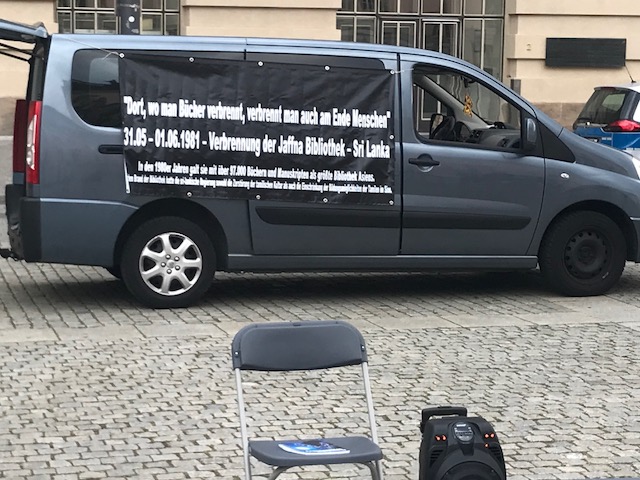 யூதர்களின் மீது இன அழிப்பை மேற்கொண்டபோது ஹிட்லர் தனது நாசிப் படைகளை ஏவி யூதர்களின் படைப்புகளைத் தேடித் தேடி அழித்த வரலாற்று நினைவிடத்தில் (Bebelplatz) சென்ற வெள்ளிக்கிழமை சிங்கள பேரினவாத அரசு மேற்கொண்ட இனவழிப்பில் முக்கிய நிகழ்வான யாழ் பொது நூலக எரிப்பின் 37 வது ஆண்டு நினைவேந்தலாக கவனயீர்ப்பு கண்காட்சி நடைபெற்றது.