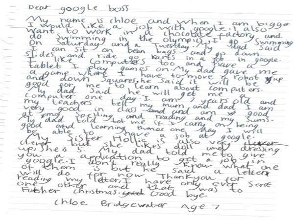 இந்நிலையில்,கூகுள் நிறுவனத்தில் தனக்கு வேலை வேண்டுமென கடிதம் எழுதியுள்ளார் இங்கிலாந்தைச் சேர்ந்த ஓர் 7 வயது சிறுமி.அவர் பெயர் க்ளோயி பிரிட்ஜ்வாட்டர்.அவர் கூகுள் நிறுவனத்தின் சிஇஓ வான தமிழர் சுந்தர் பிச்சை அவர்களுக்கு எழுதியுள்ள கடிதத்தில்”என் பெயர் க்ளோயி நான் பெரியவளானதும் கூகிள்ல வேலை செய்ய விரும்புறேன்.