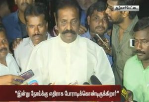 கருணாநிதியின் உடல்நிலை சீராக இருப்பதாக மருத்துவமனை நிர்வாகம் தெரிவித்திருப்பது மகிழ்ச்சியை தருவதாக கவிஞர் வைரமுத்து தெரிவித்துள்ளார். கருணாநிதியின் மரபணுக்களிலேயே போர்க்குணம் கலந்திருப்பதாகவும், மக்களுக்காக பல போராட்டங்களை கண்டவர், இன்று நோய்க்கு எதிராக போராட்டம் நடத்திக்கொண்டிருப்பதாகவும் வைரமுத்து குறிப்பிட்டார். இந்த போராட்டத்திலும் அவர் வெல்ல வேண்டும் என விரும்புவதாகவும் வைரமுத்து தெரிவித்தார்.