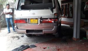 வாள்களுடன் புகுந்த கும்பல், வீட்டின் முன் தரித்து நின்ற வேனின் கண்ணாடிகளை அடித்து சேதப்படுத்தியதுடன், அதன் முன் பக்கத்தில் தீவைத்துள்ளது.